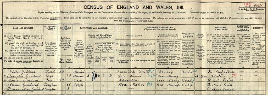 1911 Census showing Lace Workers living on Red Street, Nottingham