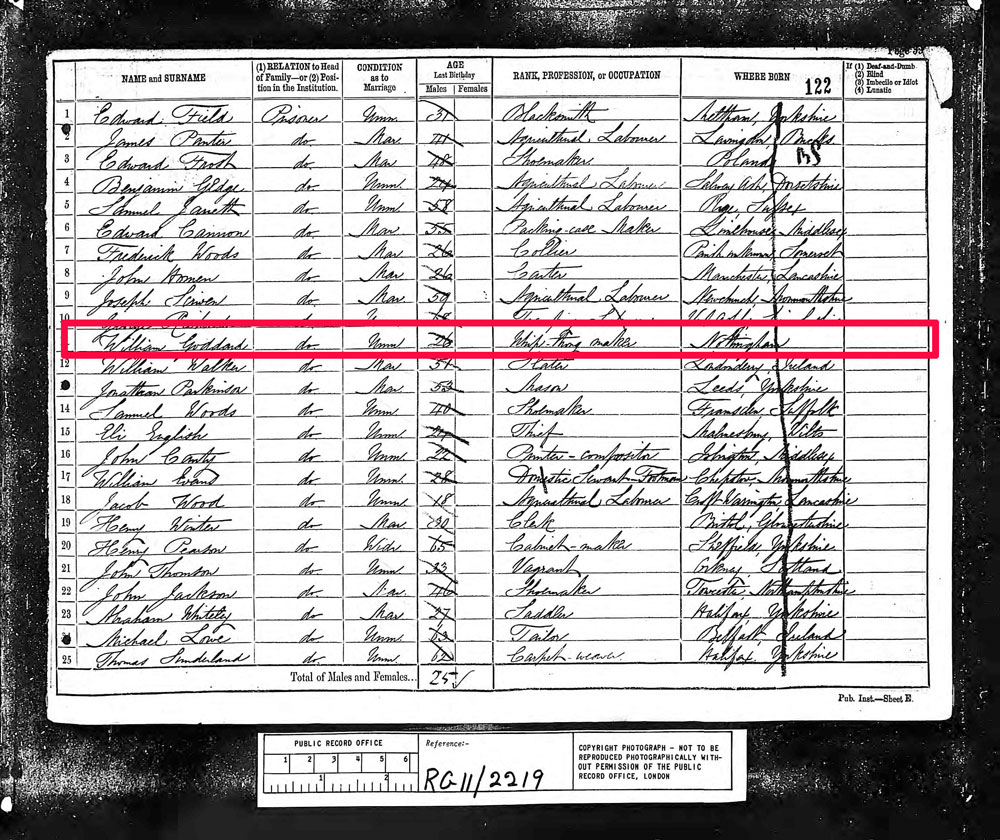 This is my 2× great-grandfather, William Goddard, my convict ancestor, photographed the day he arrived at Millbank Prison in London on the 5th February 1880. He had been sentenced to seven years’ penal servitude for stealing a jacket and what looked like the contents of a washing basket from Mrs Bearder.