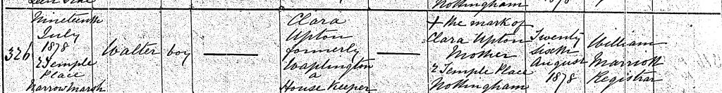 William went back to Nottingham and worked as a labourer where he could. Unfortunately, William got himself into big trouble again in 1888 (another post to come). In 1911, he lived at 4 Kenton Square off Mortimer Street. My grandfather was born at 9 Kenton Square, the same year so were neighbours. William did have another son, a William born in 1886, who unfortunately died of gunshot wounds at Gallipoli in 1915. William himself died in 1924 in Bagthorpe Workhose on Hucknall Road, aged 69.