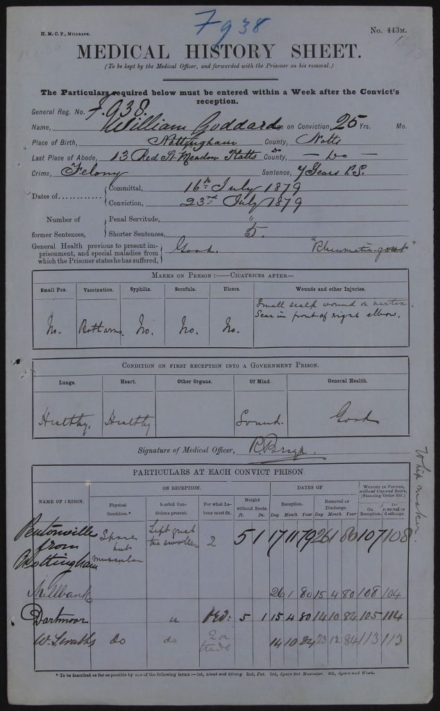 Five years of hard labour. The sentence was brutal: Pentonville → Millbank → Dartmoor → Wormwood Scrubs. The prison file (HO 140/37, The National Archives) survives in full and makes grim reading: